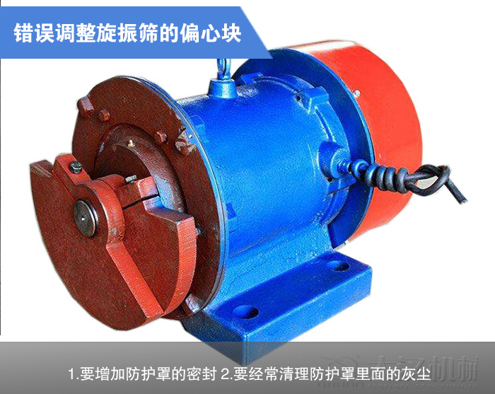 調(diào)整圓振動(dòng)篩偏心塊時(shí),誤把兩端偏心塊的方向調(diào)反,使振動(dòng)電機(jī)產(chǎn)生一個(gè)空間扭矩,使振動(dòng)電機(jī)在非正常狀態(tài)下工作,進(jìn)而引起燒毀。因此調(diào)整偏心塊時(shí),一定要注意其對(duì)稱性,即兩端偏心塊要兩兩對(duì)應(yīng),或者說(shuō)是兩端偏心塊的重心連接線要與轉(zhuǎn)軸平行,不能成異面狀態(tài)。由于振動(dòng)電機(jī)的工作環(huán)境大都非常惡劣、粉塵大,如果防護(hù)罩密封不嚴(yán),很容易進(jìn)灰塵,引起偏心塊的摩擦運(yùn)轉(zhuǎn),從而燒毀電機(jī)。所以在工作環(huán)境惡劣的地方,